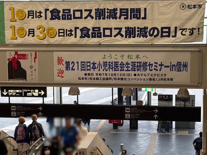 前日から、JR松本駅には「歓迎 第21回日本小児科医会生涯研修セミナーin信州」の横断幕を掲げていただき、松本駅に到着いたしました時には大変感動いたしました。