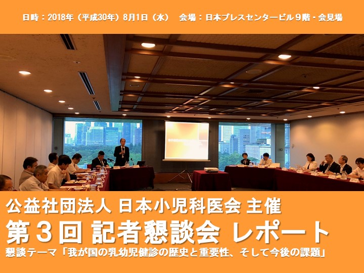 2018年8月1日 午後6時半から日本プレスセンタービル9階において「第3回 記者懇談会」が開催されました。今回の懇談テーマは「我が国の乳幼児健診の歴史と重要性、そして今後の課題」です。