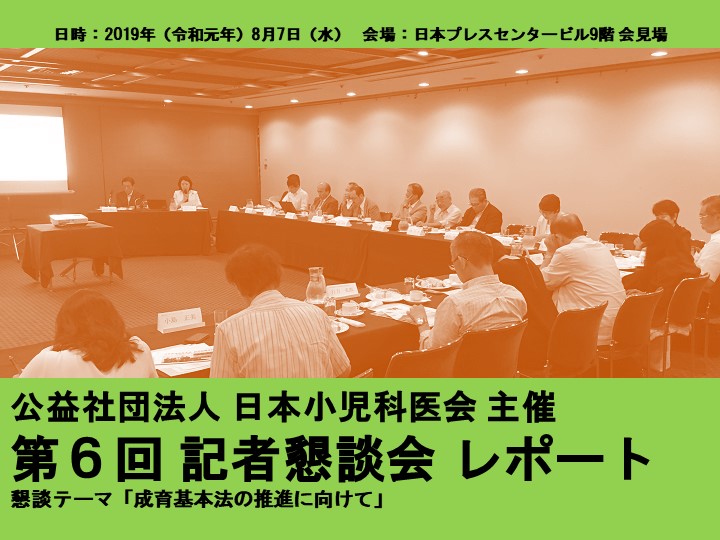 日本小児科医会 第6回記者懇談会が、令和元年8月7日(水)午後6時半から、日本プレスセンターにて開催されました。今回のテーマは「成育基本法の推進に向けて」です。 参加者はマスコミ関係の方々と当会役員を含め37名でした。