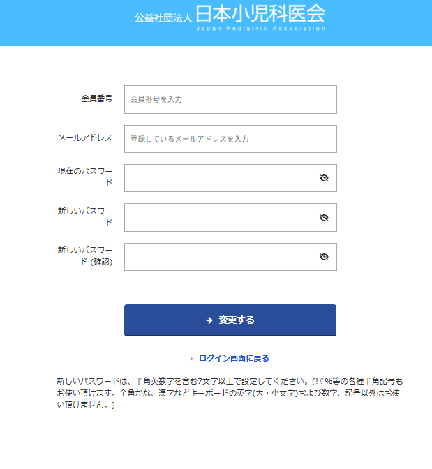 ログイン画面「パスワードを変更したい方はこちら」から自由にパスワード変更を頂けます。「会員番号」「メールアドレス」「現在のパスワード」を入力後、新しいパスワードを入力してください。